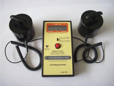 在表面上人活动区域选定的一组2点间或几组2点间检测,将仪表的两根测试线分别置于EARTH与LINE两端,两个测夹分别于两个标准电极连接,将标准电极置于被测物体的表面上,待仪表稳定后读数,得出两点之间的电阻值。