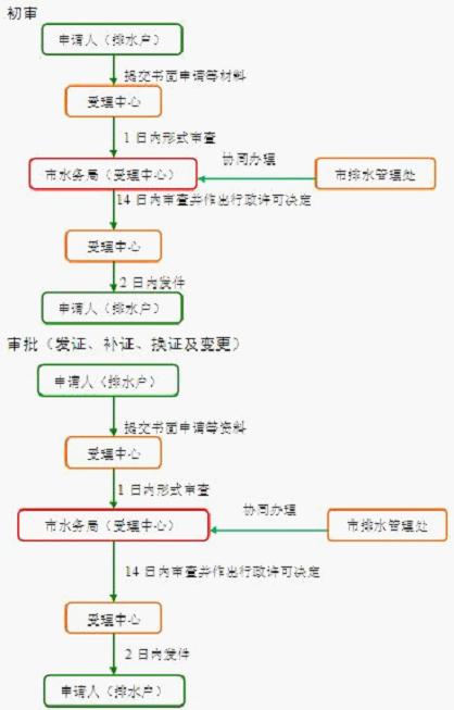 1.申请:申请人根据排水许可初审批准文件,办理排水接管后向上海市水务局(受理中心)提出申请并提交相关材料。